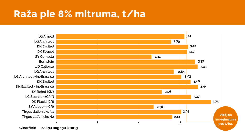 • 2024. gada vēlā sēja parādīja, ka ģenētiski noteiktā attīstība rudenī ir izšķiroša. Strauji augošie hibrīdi LID Caliento un LG Scorpion veidoja spēcīgus augus un deva augstāku ražu. Vidēji intensīvi augošajiem LG Architect, LG Arnold, DK Excited, DK Sequel, SY Cornetta, Bernstein, SY Robot (Clearfield segmenta hibrīds), DK Placid 29.08.2024. sējas termiņš bija nedaudz par vēlu, un ražas potenciāls netika sasniegts, kaut gan sākotnēji laika prognozes un temperatūru summa bija pietiekoša, lai augi rudenī līdz ziemošanai varētu sasniegt nepieciešamo augu attīstības stadiju.