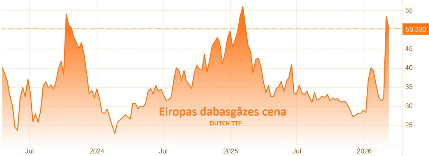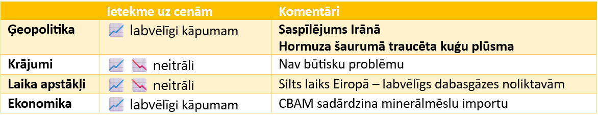 Dabasgāzes cena Eiropā uz pavisam īsu mirkli sasniedza 68 EUR/mwh cenu pēc kā piedzīvoja kritumu līdz 45 EUR/mwh cenu zonai, virs kuras turpina svārstīties. Noliktavas ar 29,27% piepildījumu ir stabilas, tā kā ziemas sezona tuvojas beigām. Trauksmainajos laikos palīdz ar siltais laiks, kurš sasniedzis lielāko daļu Eiropas un solās saglabāties siltāks kā parasti šajā laikā. Spiedienu uz cenu rada traucētais Kataras eksports uz Eiropu, bet patiesībā tas veido tikai 6% no kopējā sašķidrinātās gāzes importa, kamēr lielāko daļu piegādā ASV. CBAM tarifa dēļ, dabasgāzes infrastruktūras stabilitāte ir stratēģiskas nozīmes arī minerālmēslu un graudu nozarēm.