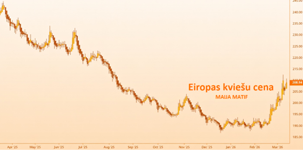 Kvieši ceturtdienu noslēdza ar 209,25 EUR/t cenu, salīdzinot ar 198 EUR/t cenu ap kuru kvieši svārstījās februāra beigās. Kviešu cena sekoja tai pašai dinamikai, kura redzama enerģētikas un minerālmēslu segmentos, lai arī mazākā apmērā, tāpēc saprotams, ka cenā vismaz daļēji ir iekļauta ģeopolitiskās situācijas prēmija. Atšķirībā no enerģētikas produktiem, kviešus turpināja ietekmēt CBAM tarifs un minerālmēslu pieejamības problēmas un kaut kādā līmenī abas problēmas pat saplūda. Uz ģeopolitisko tematu fona – raža, pieprasījums, laika apstākļi, noliktavas un citi citkārt būtiski jautājumi bija samērā neredzami. Ja globālie tirgi zaudēs ģeopolitiskās situācijas prēmiju, tad sagaidāms, ka kvieši nebūs izņēmums un zaudēs attiecīgo kāpuma daļu.
