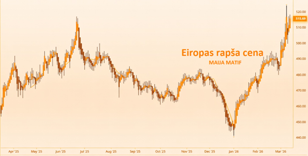 Rapsis ceturtdienu noslēdza ar 515 EUR/t cenu, salīdzinot ar 484 EUR/t cenu ar kādu iesāka tirdzniecību 27. februārī. Līdzīgi kā kviešu un enerģētikas produktu sekcijās, arī rapsis ir iekļāvis ģeopolitisko prēmiju, kura ir atkarīga no tālākās konflikta gaitas. Bet ir sagaidāms, ka kuģu satiksmes apstāšanās Hormuzas šaurumā nav ilgtermiņa problēma un satiksme tiks atjaunota, jautājums ir kad tas notiks.
