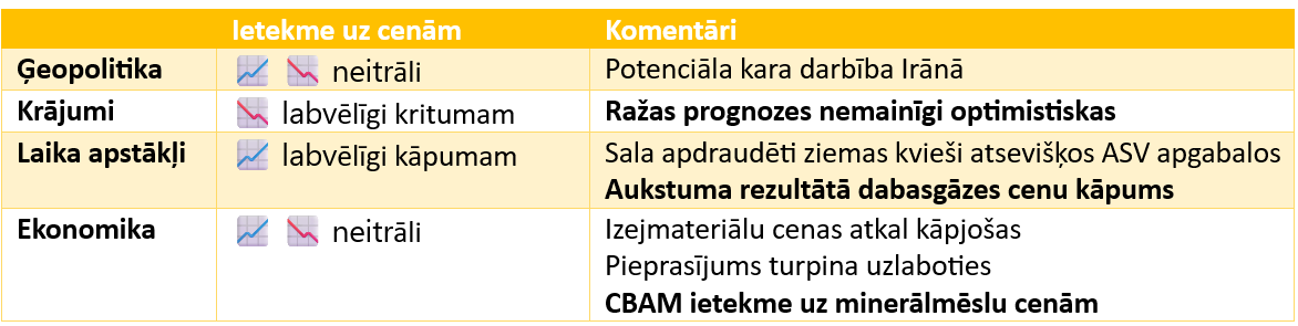 Laika apstākļi pasaulē ir samērā stabili un uz doto brīdi nav indikāciju, ka laika apstākļu rezultātā varētu notikt būtiska atkāpe no esošajām ražas aplēsēm. Nozīmīgākais faktors ir skarbā ziema – nepietiekoša sniega sega varētu būt kaitējusi kviešu ražai atsevišķos ASV apgabalos, bet bojājumu apjoms pagaidām nav zināms. Latvijā gaidāms stiprs sals, bet sniega sega ir apjomīga visos valsts reģionos.