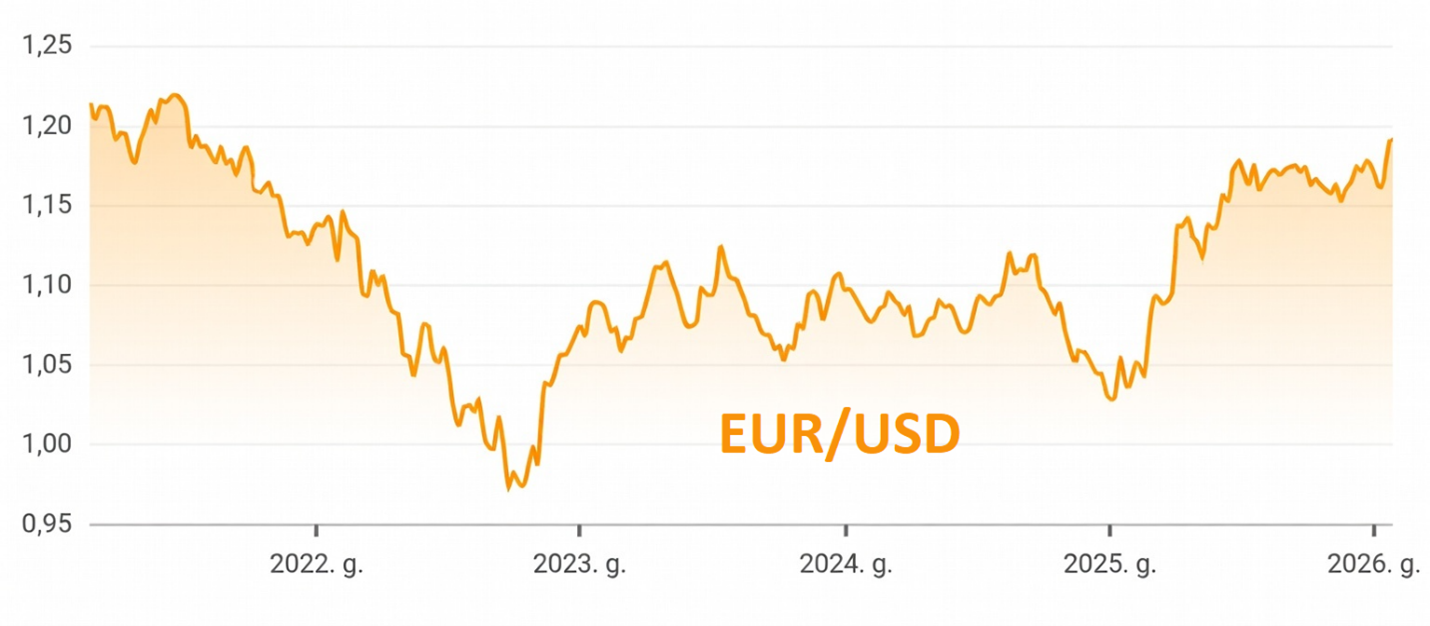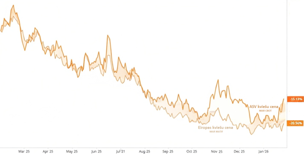 Dolāra vājums stiprina ASV lauksaimnieku konkurētspēju un vājina to Eiropā. Eiro vērtība turas pie daudzu gadu rekorda – 1,20 atzīmes. Piemēram, ja 12,5% proteīna cena dolāra telpā ir 224 USD/t, tad 2026. gada janvārī, konvertējot pie 1,20 kursa, cena ir 186,67 EUR/t. Savukārt, tādu pašu cenu konvertējot pēc 1,04 kursa 2025. gada februārī, gala cena sasniedz 215,38 EUR/t. Čikāgas biržā tirgoto MAR CBOT kviešu vērtība konvertēta uz eiro telpu pēc šī brīža kursa – 165 EUR/t. Ja vājš dolārs ir apzināta ASV politika, lai kāpinātu savu eksportētāju konkurētspēju, tad šī problēma varētu saglabāties ilgākā termiņā.