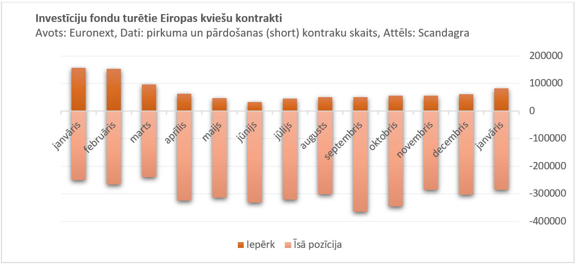 Fondu pozīcija pret Eiropas kviešiem ir bijusi samērā nemainīga. Kopējais investīciju fondu negatīvisms pret kviešiem ir 202,2 tūkstošus pozīciju liels, salīdzinot ar 90,9 tūkstošiem iepriekšējā gada janvārī, liecina Euronext dati.