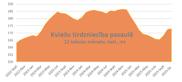 Pieprasījums pēc kviešiem turpina uzlaboties, liecina tekošo 12 mēnešu tirdzniecības dati pasaulē. Kāpums turpinās kopš 2025. gada vasaras.