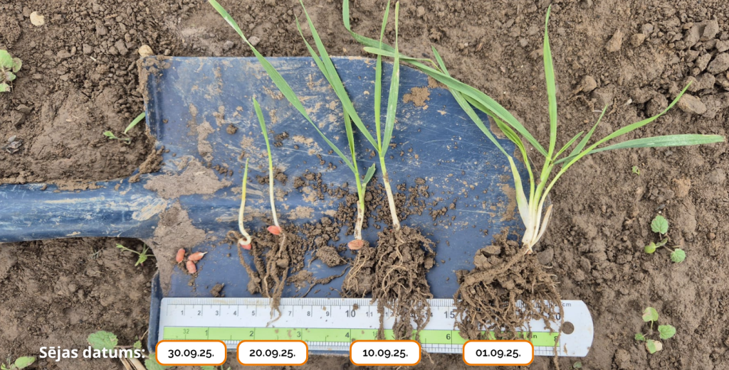 Ziemas kviešu sējumi vēsā laika ietekmē dīgst un attīstās lēni. Pirmajā dekādē sētiem ziemas kviešiem bija pietiekams siltums un augsnes mitrums – tie sadīga nedēļas laikā, un jau daudzviet vērojami sējumi cerošanas stadijā (AS 21–25). Savukārt septembra otrajā dekādē sētie pārsvarā sasnieguši 2–3 lapu stadiju.