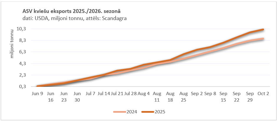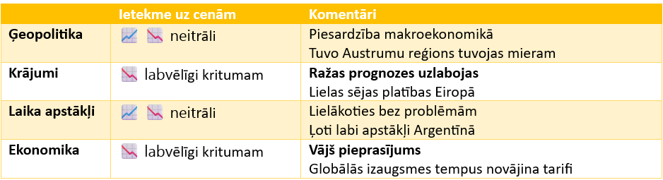 Krievijas kviešu ražīgums pie 95% pabeigtas pļaujas ir lielākais kopš 2022. gada un attiecīgi raža tiek prognozēta aptuveni 86 miljonu tonnu liela. Šī raža tiks aktīvāk virzīta tirgū un jāvēro kā tas ietekmēs cenu. Krievijas Āzijas daļā ir aktīvi sācis snigt, radot bažas par Urālu un Sibīrijas reģioniem, kur ražas novākšana vēl nav pilnībā pabeigta.