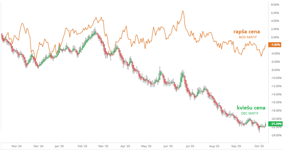 Eiropas rapša cena saglabā samērā lielu stabilitāti. Novembra MATIF atrodas 1,82% zemāk kā pirms gada šajā laikā. Sagaidāms, ka rapša cena svārstīsies esošajā diapazonā, bez izteiktām izmaiņām.