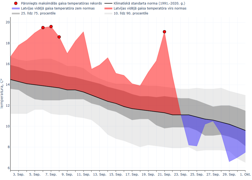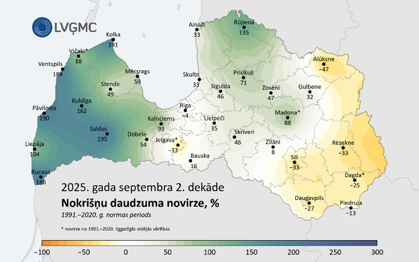 Pēc LVĢMC datiem 2025. gada septembris kļuva par ceturto siltāko septembri novērojumu vēsturē (kopš 1924. gada), nokrišņu daudzums mēneša ietvaros ir normas robežās. Savukārt, ja vērtējam šos laika apstākļus no lauksaimnieka skatpunkta, tad nokrišņu daudzums septembra otrajā dekādē Kurzemes reģionā kavēja gan augu attīstību, gan lauku darbus.